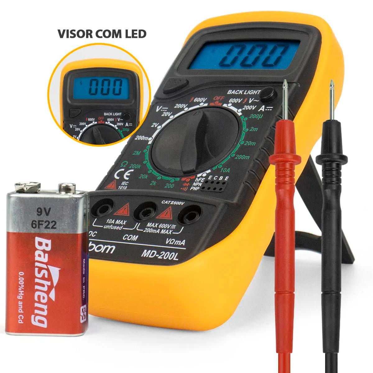 O Multímetro Digital Exbom MD-200L é uma ferramenta versátil para medição de tensão AC e DC, corrente AC, resistência e continuidade e muito mais. Possui bipe sonoro e display iluminado para fácil leitura. A bateria 9V já incluída permite uso imediato. É compacto, fácil de transportar e confiável. Ideal para profissionais e entusiastas da eletrônica.